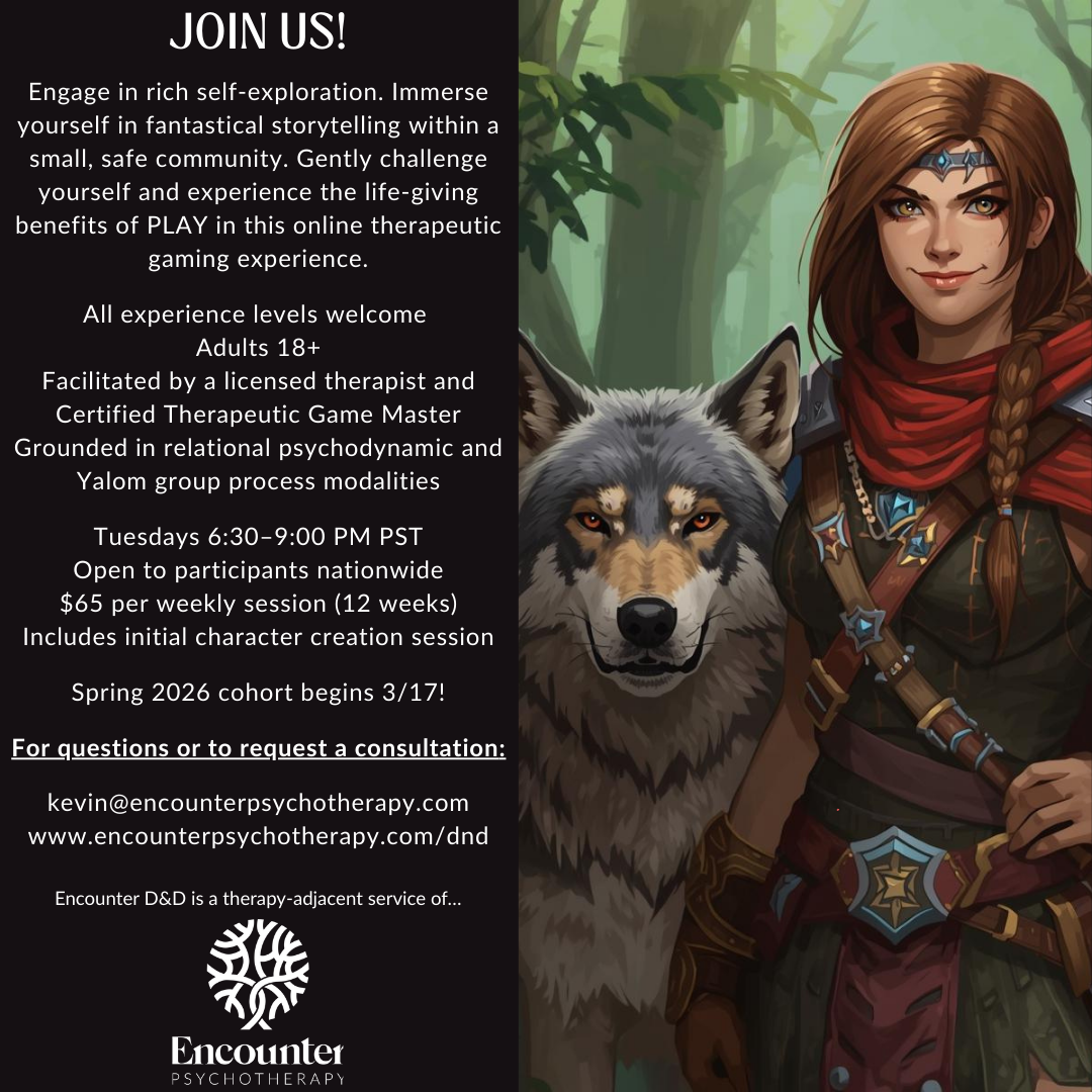 NOW ACCEPTING INQUIRIES FOR THE SPRING 2026 COHORT! Email kevin@encounterpsychotherapy.com for inquiries about joining a cohort or joining the Encounter D&D waitlist. Email Kevin for questions about the currently developing Therapeutic Gaming Facilitator Training underway as well.
